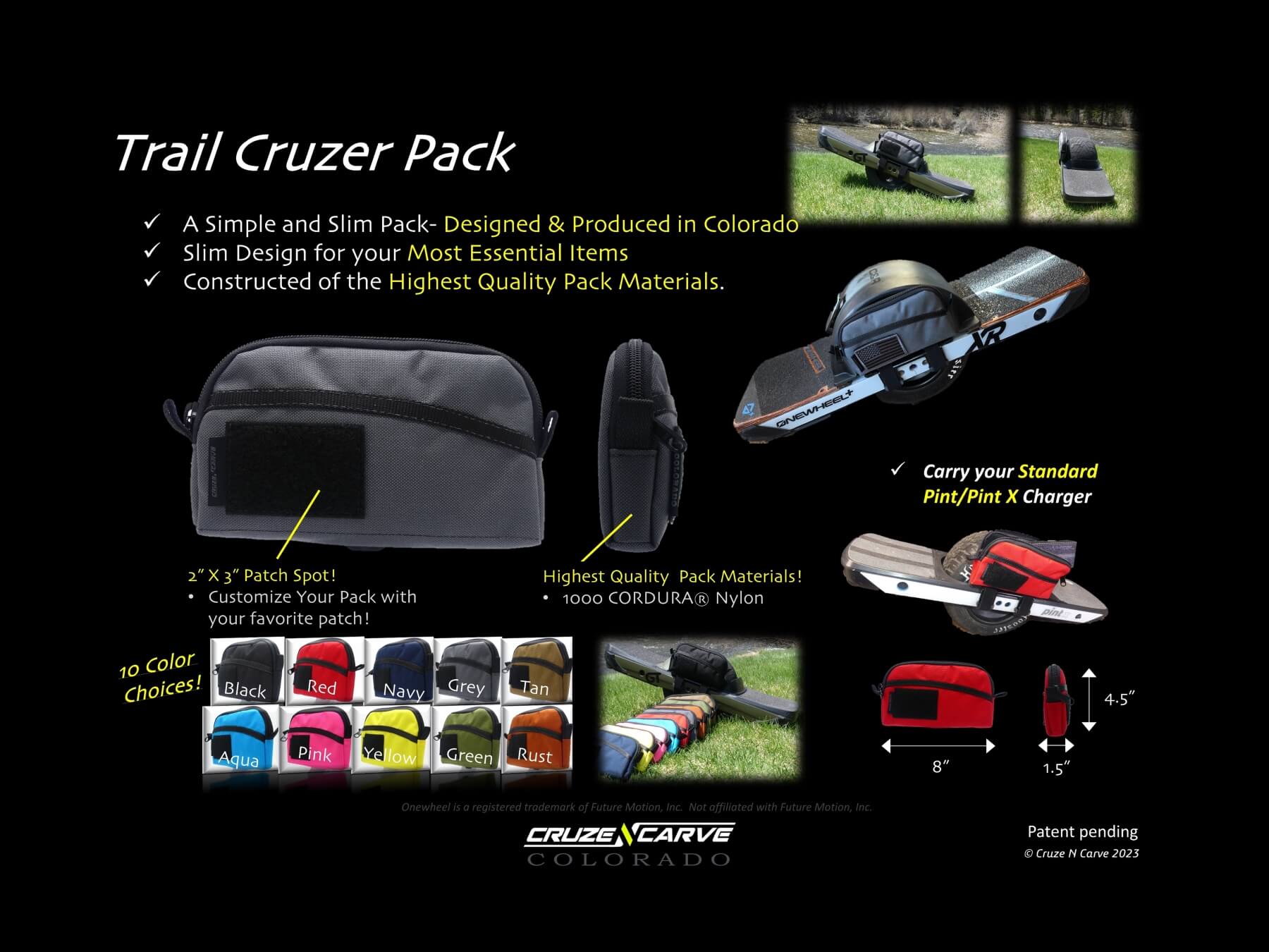 Designed and Hand crafted in Colorado USA! The Trail Cruzer is slimmer than our other Colorado packs. Slim, yet perfectly sized to still hold bulkier items such as Pint / Pint X Onewheel chargers and cords.